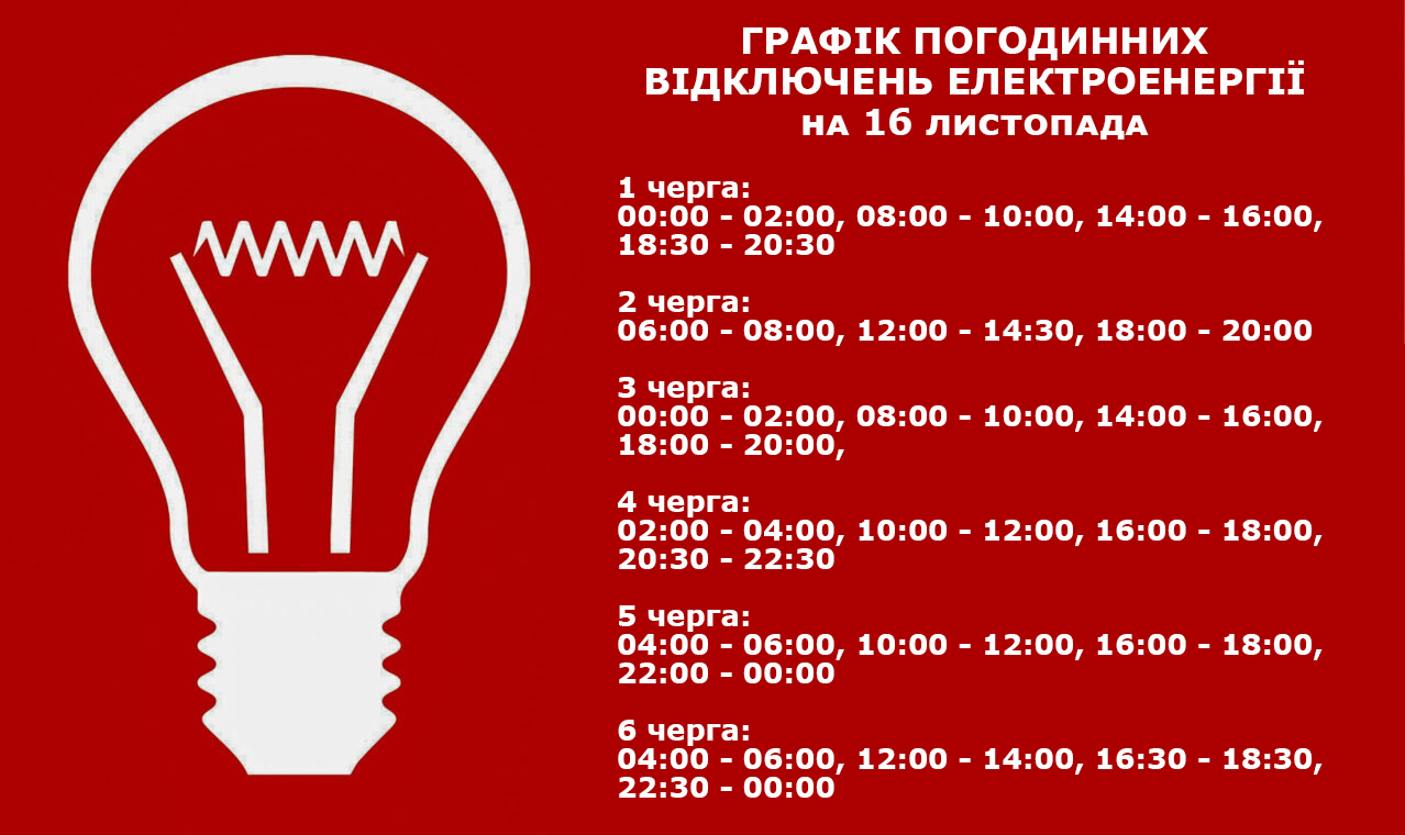 Відповідно до команди НЕК «Укренерго» 16 листопада з 00:00 до 24:00 в Золотоніській громаді будуть застосовані графіки погодинних вимкнень (ГПВ).